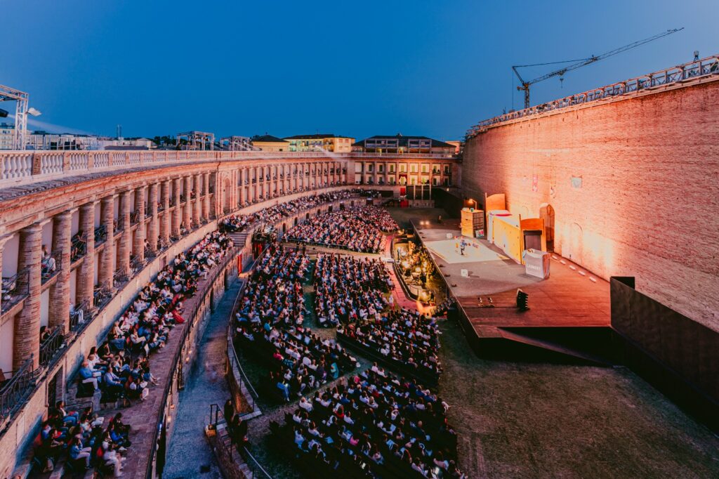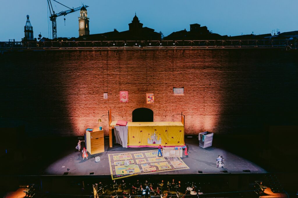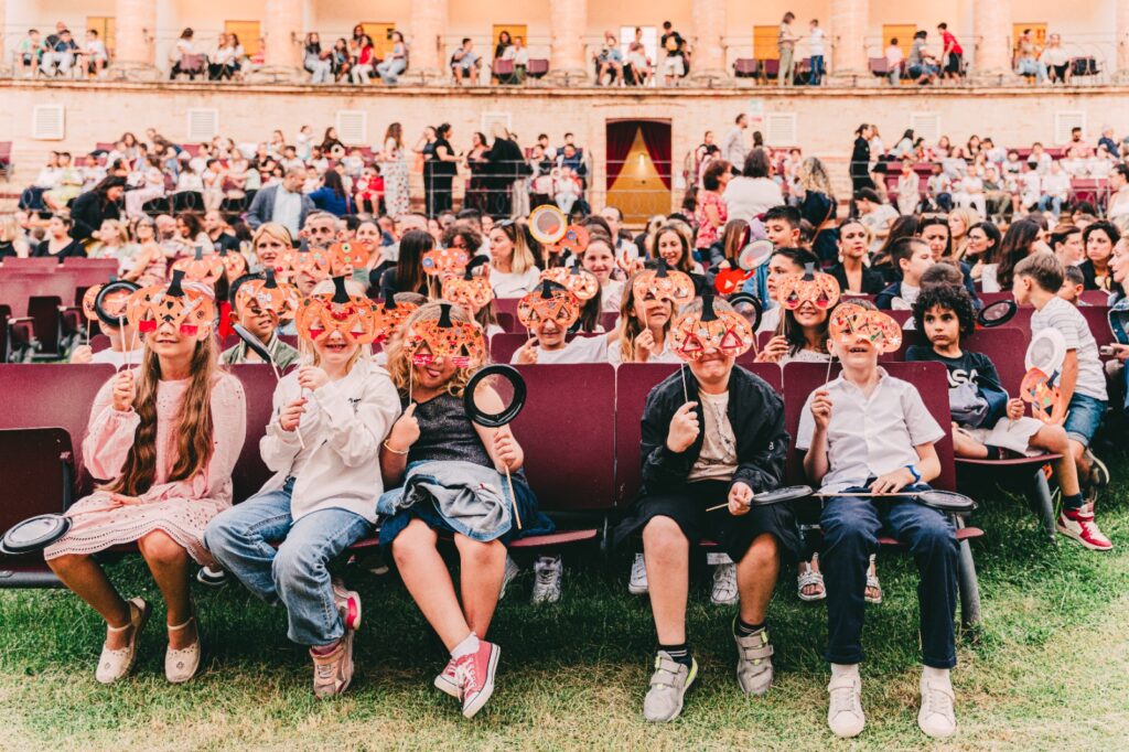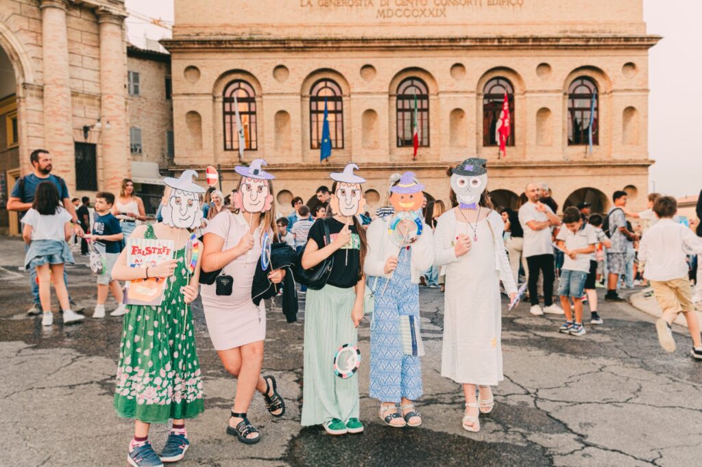 Certo, il silenzio canonico che trasforma lo Sferisterio in un santuario per l’opera dei grandi, non appartiene a questi spettacoli che propongono interazione e partecipazione. Una vera festa in cui bambini e bambine hanno usato le maschere fatte a scuola per spaventare Falstaff così come delle lenti giganti per leggere lettere segrete.
