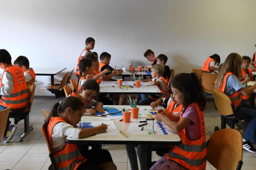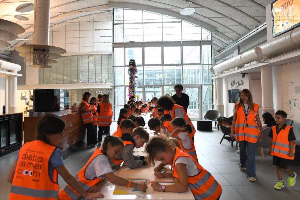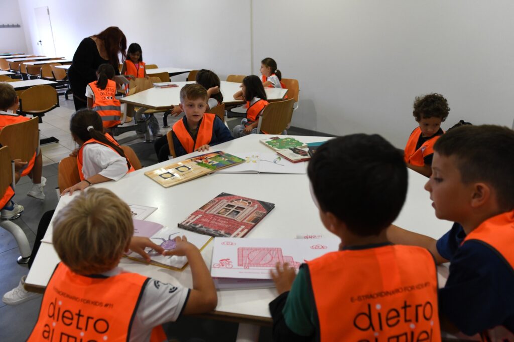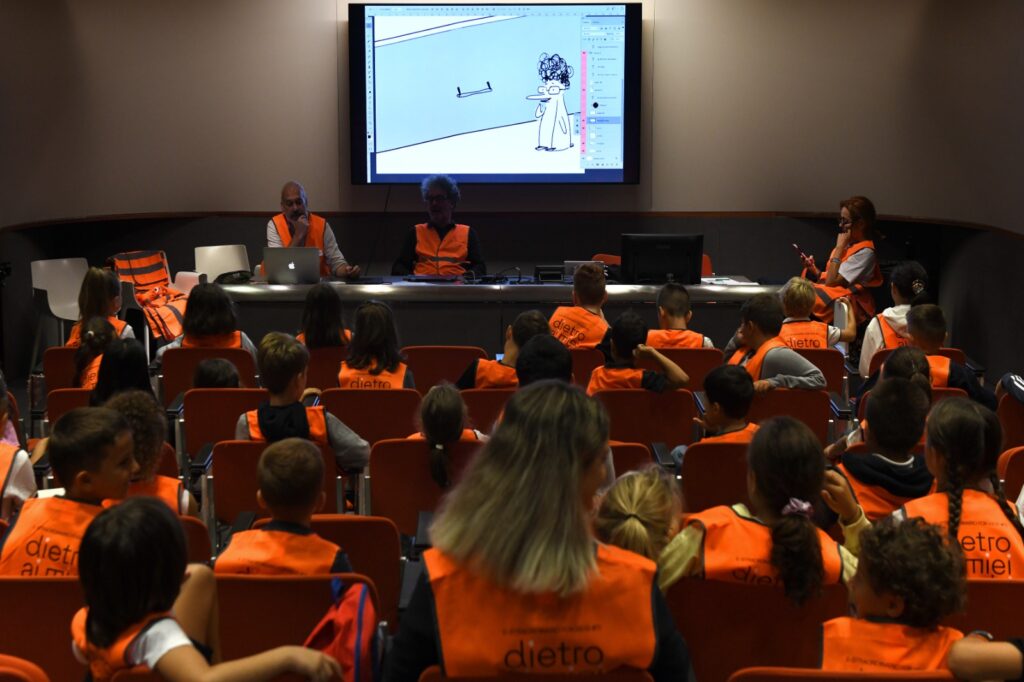 La giornata si è aperta con una lecture dell’illustratore Francesco Fagnani, che ha accompagnato i bambini e le bambine in un percorso creativo per trasformare il pensiero in racconto e il racconto in immagine, attraversando parole, emozioni e colori. L’obiettivo era di far comprendere e sperimentare ai bambini e alle bambine il processo che parte da un’idea astratta, passa attraverso il racconto e culmina nella rappresentazione visiva, introducendo in modo coinvolgente i temi del workshop.