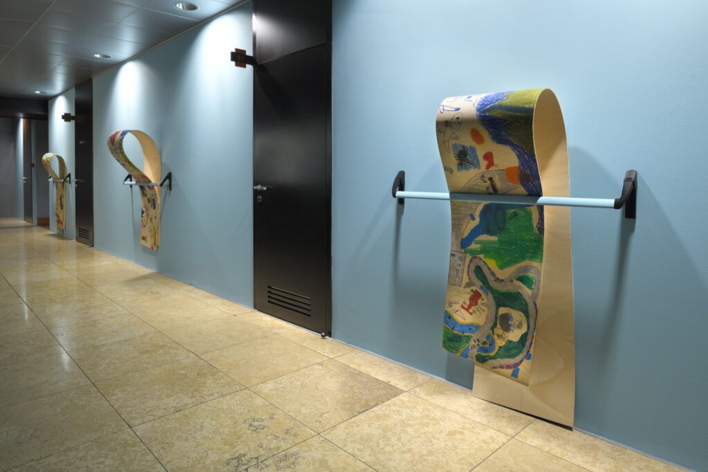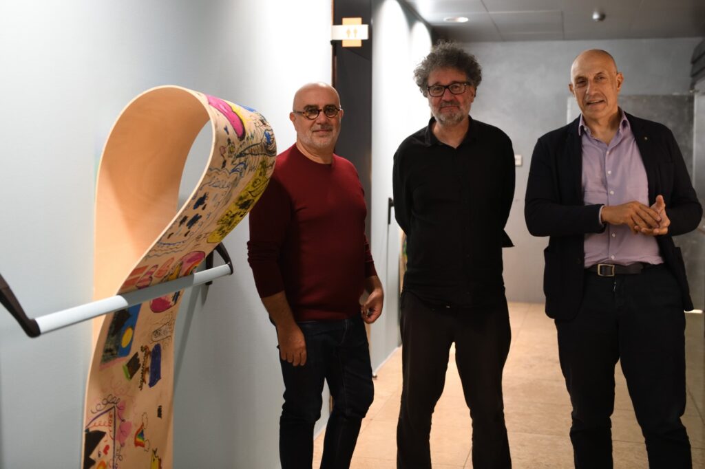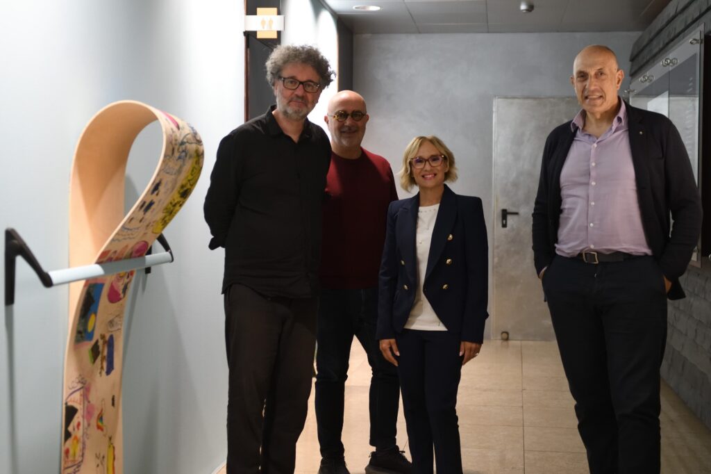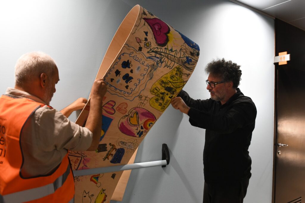 Guidati da Giovanni Termini, i piccoli e le piccole partecipanti si sono cimentati in un’attività creativa, dando forma alla loro idea di ciò che si cela “dietro una soglia”. Su grandi pannelli di legno multistrato, ciascuno ha rappresentato con colori a pastello, acrilici e materiali vari, la propria visione di ciò che si nasconde “dietro ai propri occhi”. I pannelli, progettati per essere incastrati ad arte in maniglioni antipanico, sono stati assemblati in un’installazione permanente allestita negli spazi aziendali: un’opera collettiva che simboleggia il passaggio, la scoperta e la possibilità di guardare oltre ciò che è visibile.