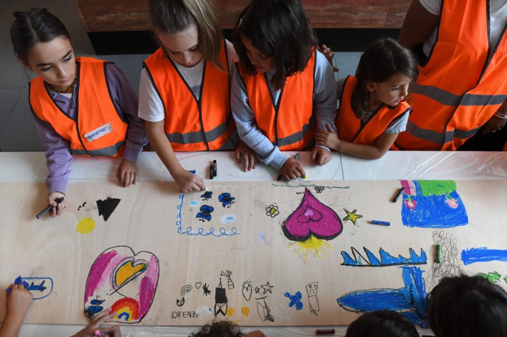 Tutto questo è E-straordinario for Kids, l’attività formativa della Fondazione Ermanno Casoli – ideata e curata da Marcello Smarrelli – dedicata ai figli e alle figlie dei dipendenti e delle dipendenti del gruppo Elica, azienda italiana all’avanguardia nella produzione di elettrodomestici per il cooking. Ogni anno l’iniziativa offre ai più piccoli l’opportunità di entrare in contatto con l’arte contemporanea attraverso l’esperienza diretta con un artista, realizzando insieme un’opera d’arte collettiva. La giornata si configura anche come open day aziendale per le famiglie, consentendo ai bambini e alle bambine di vivere l’azienda per un giorno, conoscere il luogo di lavoro dei loro genitori e scoprire come nascono i prodotti realizzati anche attraverso il loro contributo.