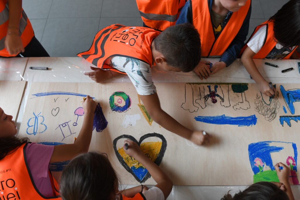 Nel corso del workshop propedeutico alla realizzazione dell’opera d’arte, Giovanni Termini ha guidato i bambini e le bambine in una riflessione immaginifica su ciò che si cela oltre una porta o un muro, spingendoli a rappresentare con forme e colori ciò che non si vede, ma che vive nella loro fantasia.