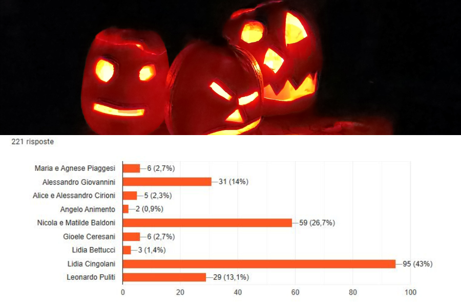 Si classificano secondi, con 59 voti, Nicola e Matilde Baldoni, che hanno realizzato addirittura due spaventosissime e anche luminosissime zucche di Halloween.